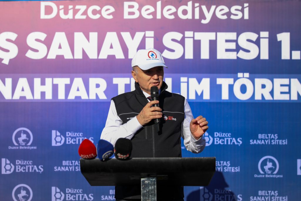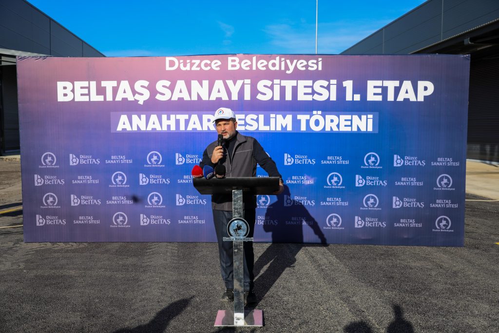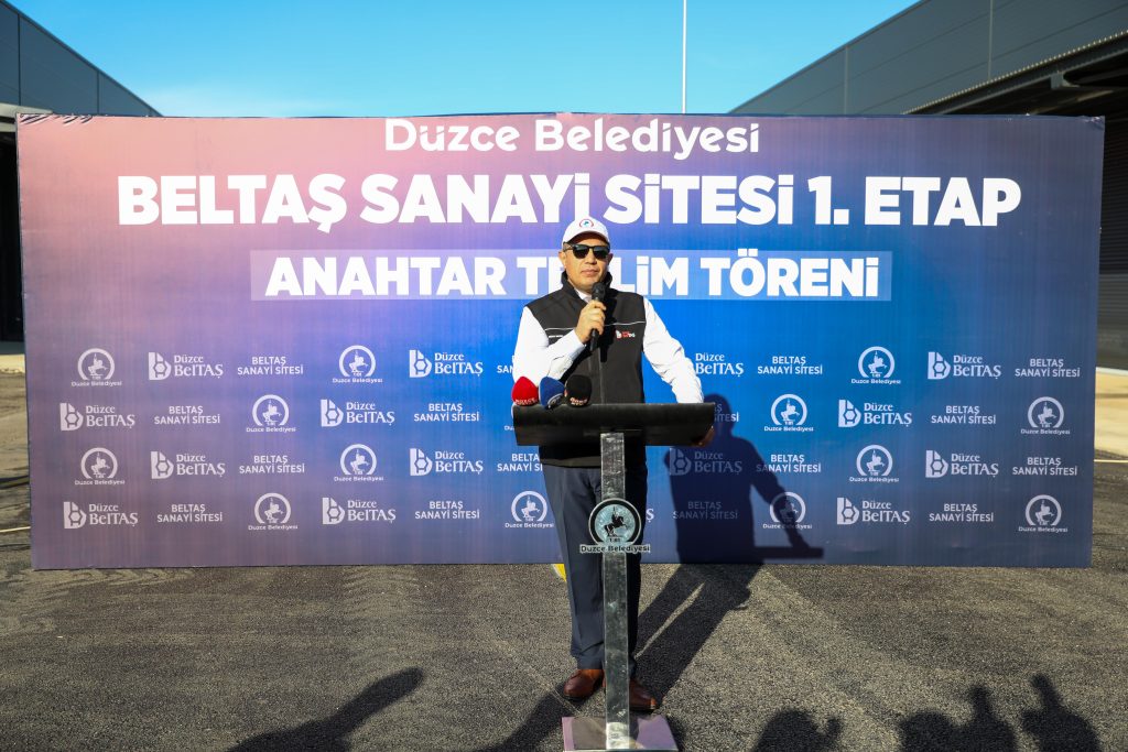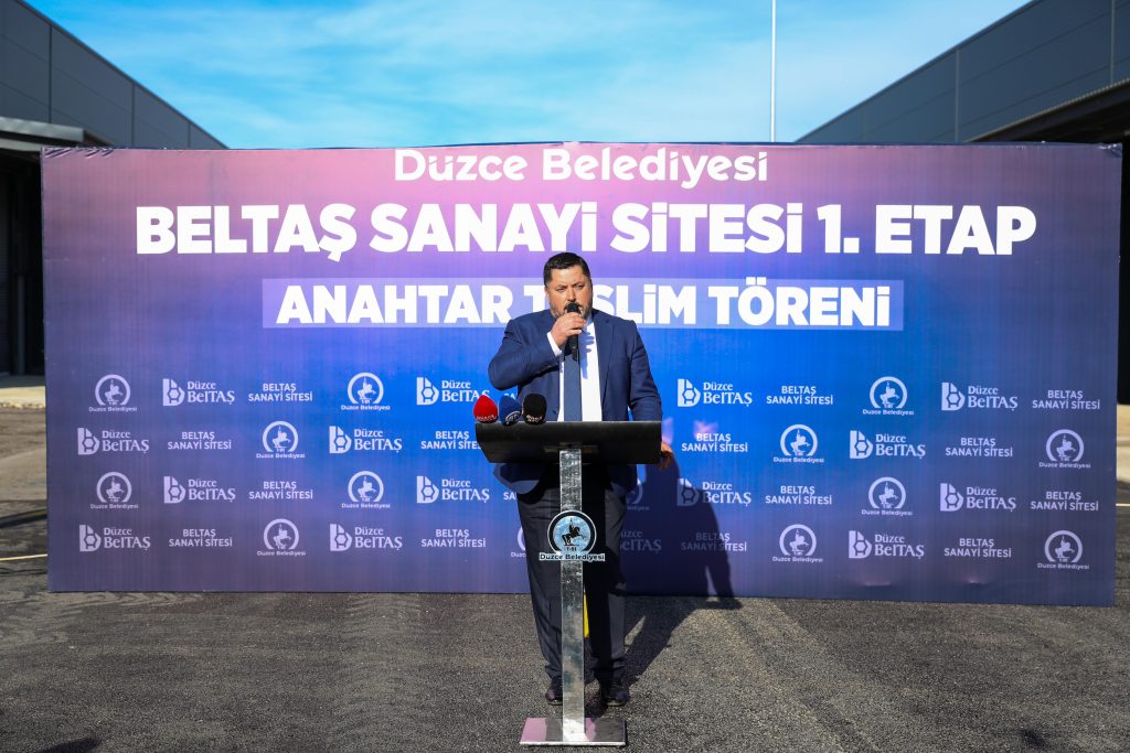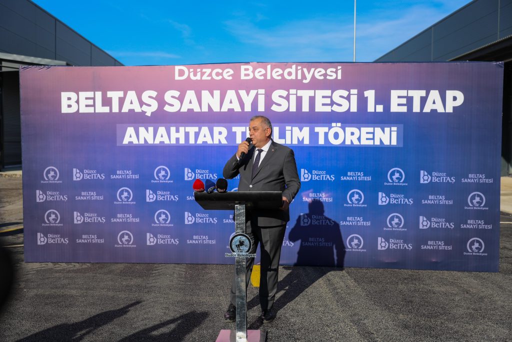 Beltaş Sanayi Sitesi yapım süreci ile konuşmasına başlayan Düzce Belediye Başkanı Dr. Faruk Özlü, projenin hızla bitirilme sürecini anlatarak; “Bakanlık yaptığım dönemde Türkiye’deki toplam sanayi sitesi sayısının 835 olduğunu ve bunların 135 tanesinin aynen burada olduğu gibi şehir içinde kaldığını ve bunların taşınması gerektiğini ortaya çıkardık. Ben o tarihte bunu saygıdeğer cumhurbaşkanımıza arz ettim, onayını aldım. Bakanlık olarak 135’inin taşınmasına karar verdik. 10 pilot il seçtik ve biri de Düzce idi. Daha sonra buraya gelip görevi devraldıktan sonra yaptığımız ilk işlerden biri; Eski Sanayi Çarşısı’nın taşınması olmuştur” dedi. Çevre ve Şehircilik Bakanı Murat Kurum’un önerisi ve onayı ile sanayi sitesi inşaatının TOKİ tarafından yapılmaya başlandığını, ancak hem maliyetlerin yüksek olması,  ayda dükkanların tamamlandığını vurguladı.
