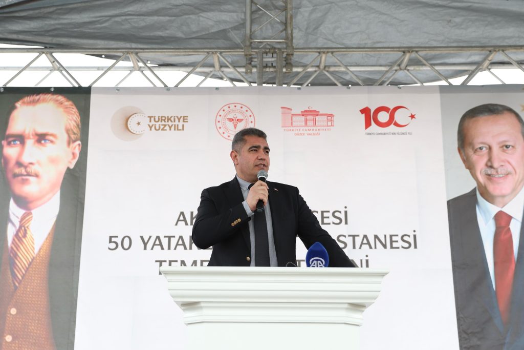 Kapkirli Mahallesi’nde inşa edilen hastanenin temel atma töreni saygı duruşu ve İstiklal Marşı’nın okunmasıyla başladı. Düzce Valisi Selçuk Aslan, burada yaptığı konuşmada, geçen yılın, Türkiye Cumhuriyeti’nin 100. yıl dönümü olarak kutlandığını anımsattı.
