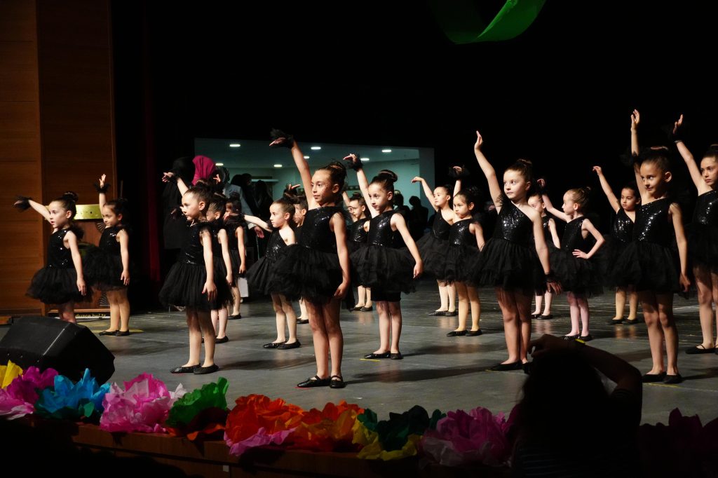 Öğrencilerin halk oyunları, modern dans ve bale performansları sergilediği etkinlikte, jimnastik