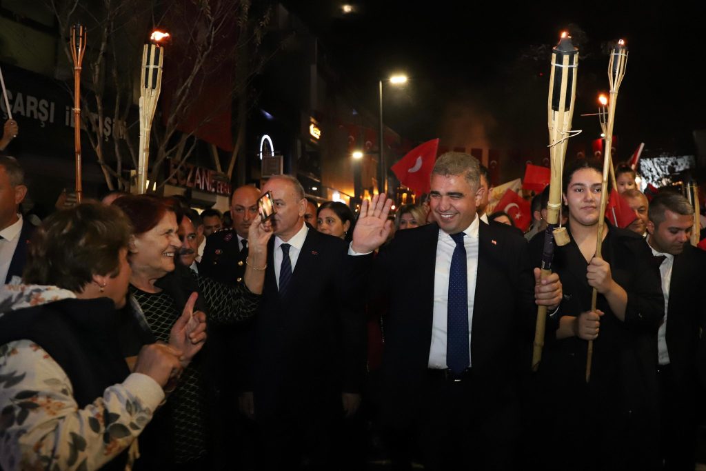 Düzce’de Cumhuriyet’in 100. yılı etkinlikleri çerçevesinde Belediye Meydanı’nda toplanan vatandaşlar, ellerindeki meşalelerle Belediye Bandosu ve Mehteran eşliğinde İstanbul Caddesi boyunca yürüdü.