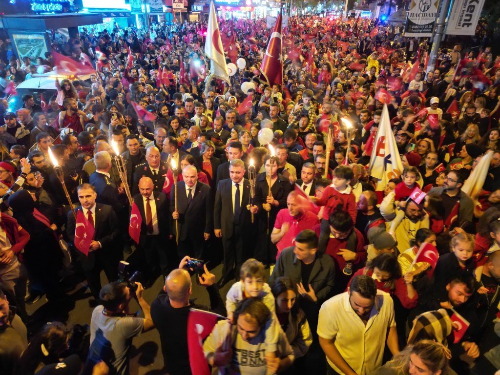 Düzce’de 29 Ekim Cumhuriyet Bayramı dolayısıyla fener alayı ve kortej yürüyüşüne on binlerce kişi katıldı.