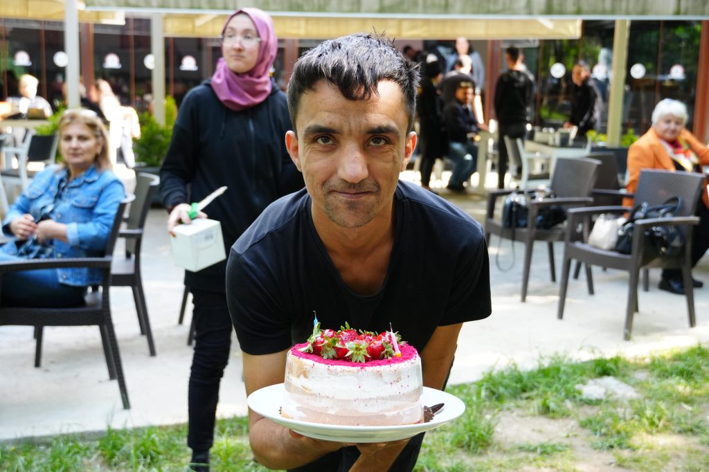 Kafe’de çalışan engelli personel ile bir araya gelerek pasta kesti.