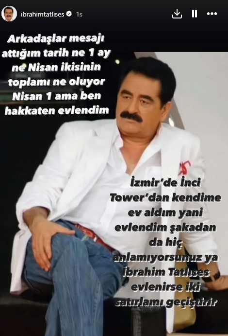 Tatlıses, 1 Nisan’da yaptığı paylaşımda “Seçimi kaybettim ve evleniyorum. Duyduk duymayın demeyin. Tüm bekarlara selam olsun ben evleniyorum” dedi. Evlendiği söylentisiyle adından söz ettiren sanatçı, yeni paylaşımda şaka yaptığını belirterek şunları söyledi: “Arkadaşlar mesajı attığım tarih ne 1 ay ne Nisan… İkisinin toplamı ne oluyor? Nisan 1 ama ben hakikaten evlendim. İzmir’de kendime ev aldım. Yani evlendim şakadan da hiç anlamıyorsunuz ya. İbrahim Tatlıses evlenirse iki satırla mı geçiştirir?”