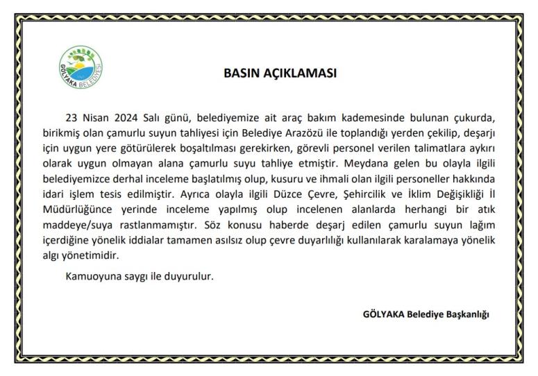 “Kusuru ve ihmali olan personel hakkında idari işlem tesis edilmiştir. Ayrıca Çevre, Şehircilik ve İklim Değişikliği İl Müdürlüğünce yerinde inceleme yapılmış olup, incelenen alanlarda herhangi bir atık maddeye/suya rastlanmamıştır. Söz konusu haberde deşarj edilen çamurlu suyun lağım içerdiğine yönelik iddialar tamamen asılsız olup, çevre duyarlılığı kullanılarak karalamaya yönelik algı yönetimidir.”