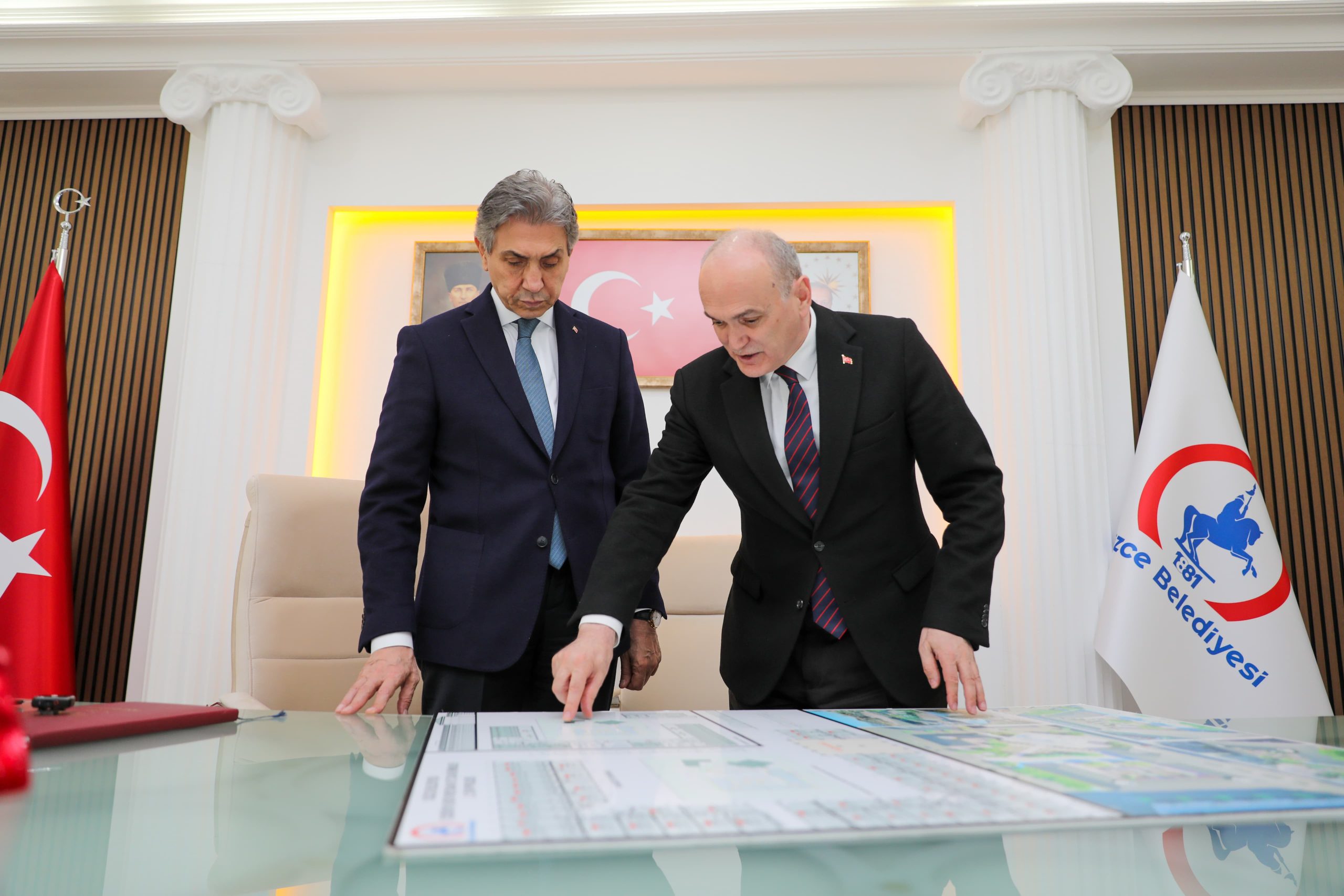 Yerel Yönetimler Başkan Yardımcısı Mücahit Yanılmaz’ın da katılımı ile başkanlık makamında gerçekleşen ve belediye başkan yardımcıları ile meclis üyelerinin de hazır bulunduğu ziyarette konuşan Düzce Belediye Başkanı Dr. Faruk Özlü, Cedidiye Kent Meydanı Projesi hakkında bilgiler sundu.